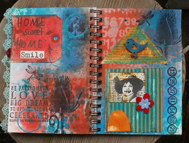 ich habe mal wieder meine art journay stempel rausgekramt und eine seite für AJJ und JJ's Gemacht wo das thema zuhause ist,es passt auch gut zur journal journay challenge zum thema numbers.
